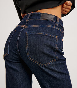 Alamitos Flared Denim Pant with Front Patch Pockets, Belt Loops and Zipper Button Fly in Salt White Colorway. Front Detail View Shown on Model.