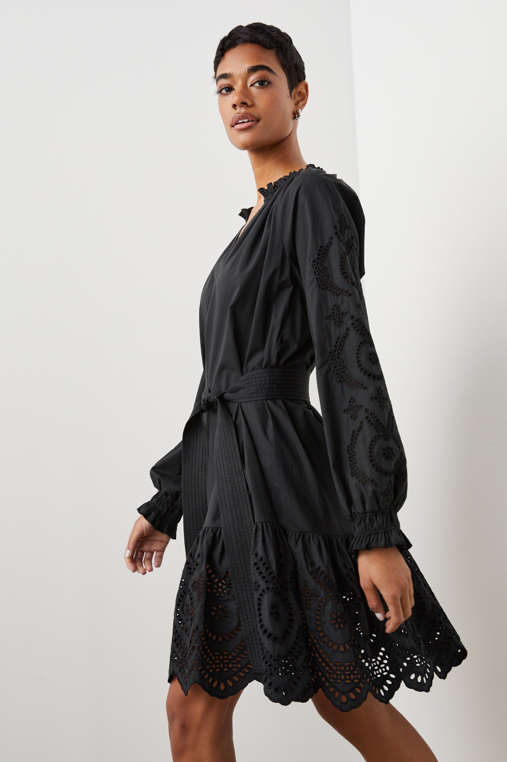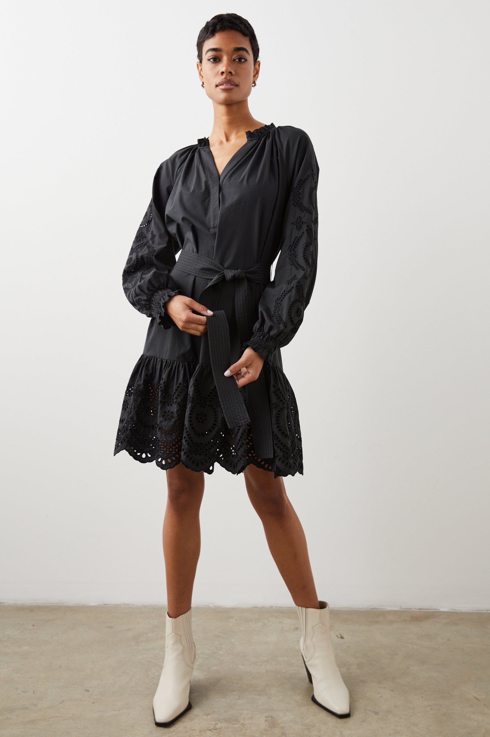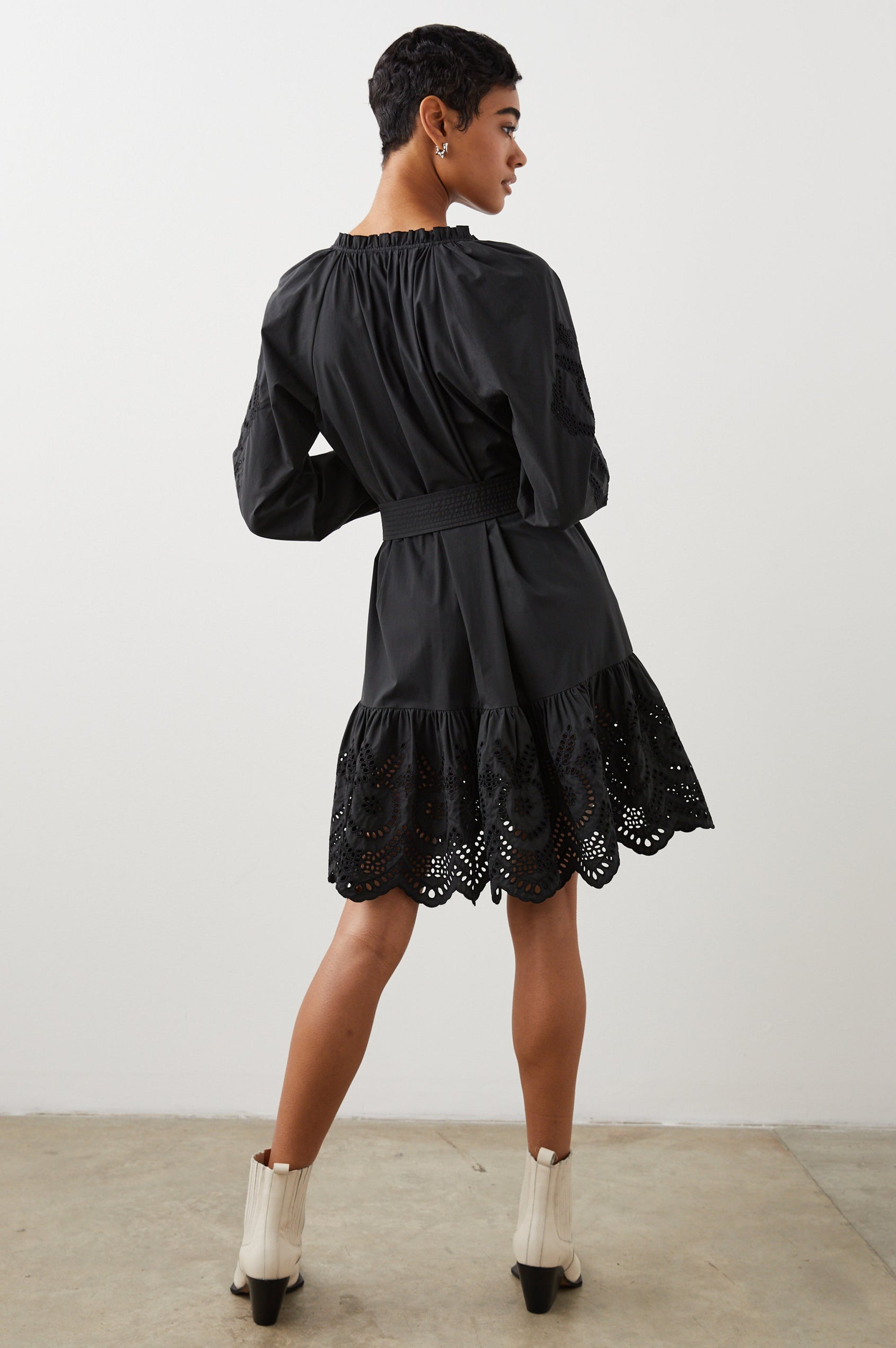 The little black dress that works year-round, the Saylor is your new go-to for a one-and-done look. Made from crisp cotton poplin and complete with intricate eyelet details on the sleeves and bottom hem, this style looks just as good with sandals as it does with tights and boots.