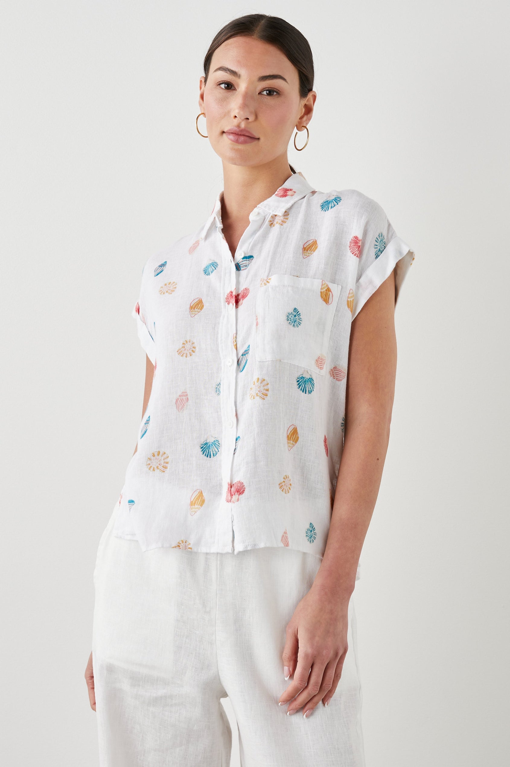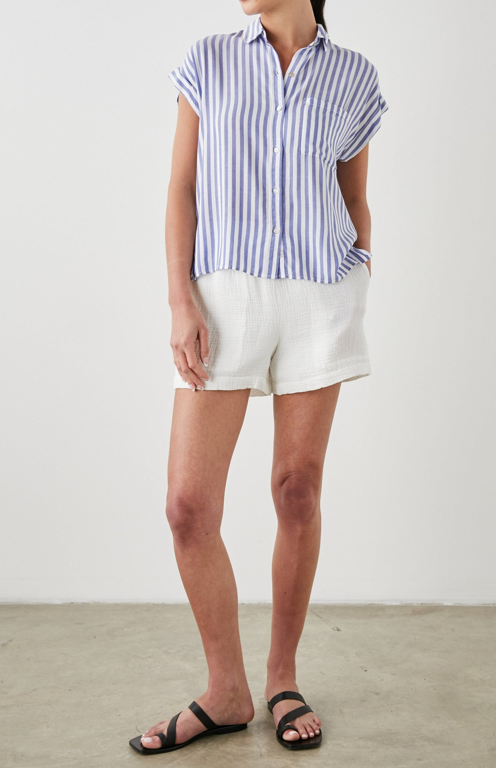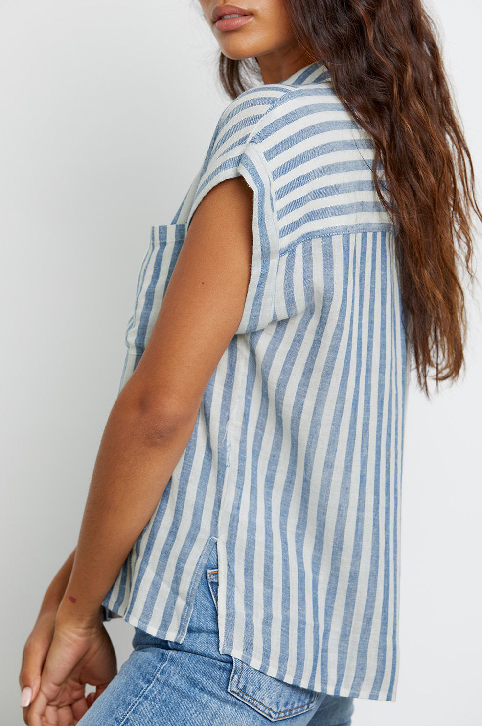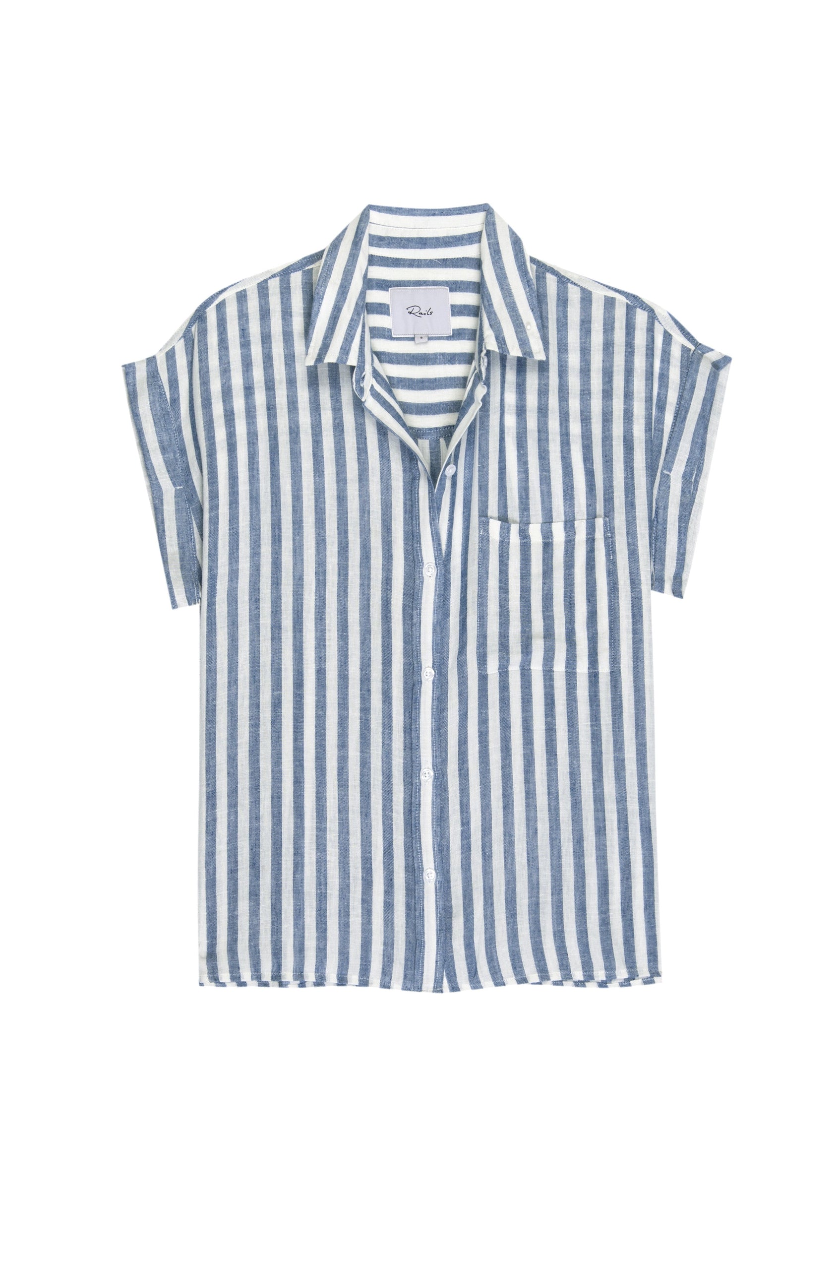 Lightweight, breezy linen fabric mixed with a relaxed body shape makes the Whitney the perfect Southern California inspired button-down. This short sleeve button-down features a subtle navy pineapple striped design throughout, rolled sleeves, high-low hem, and flattering side slits.