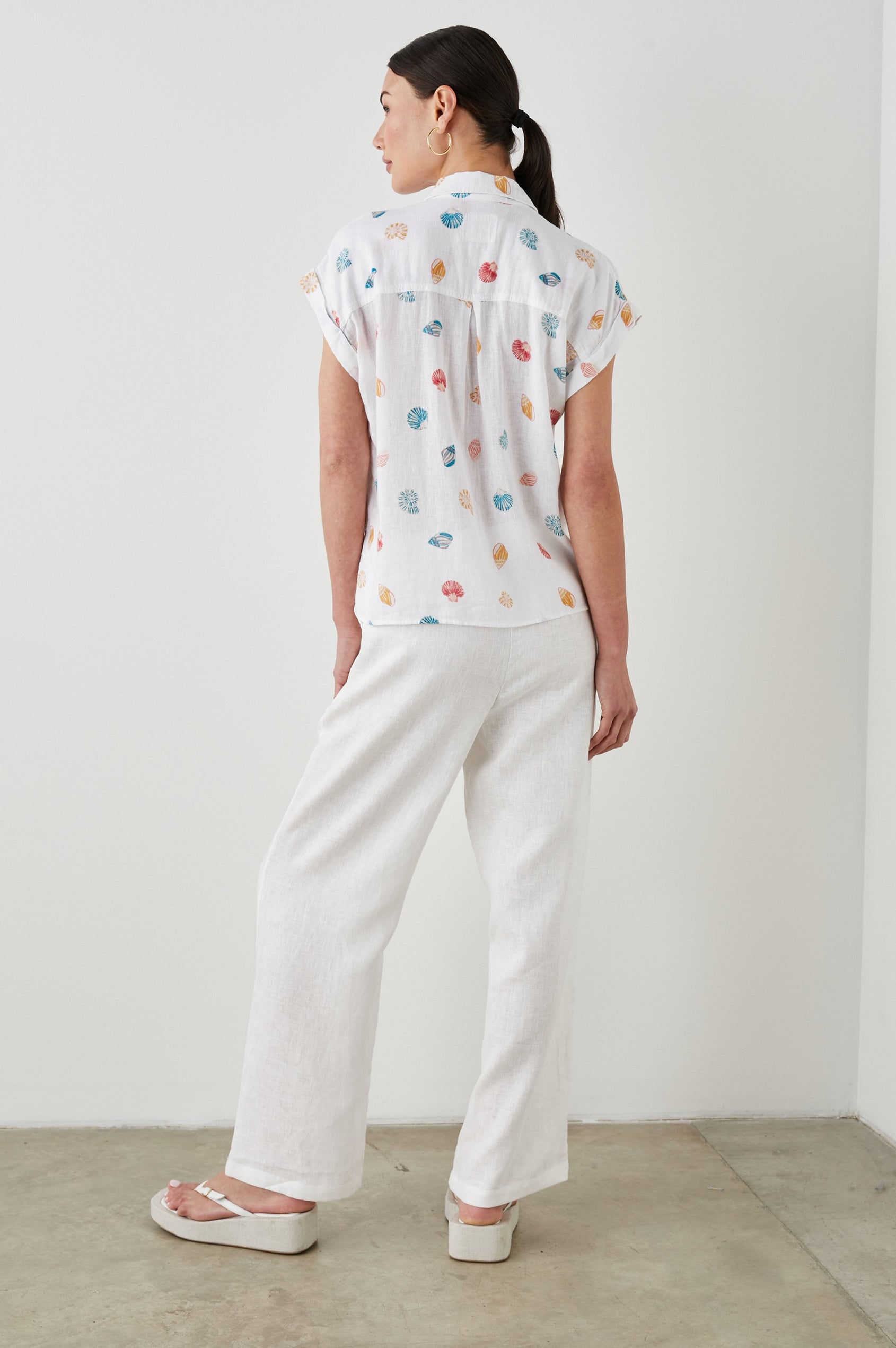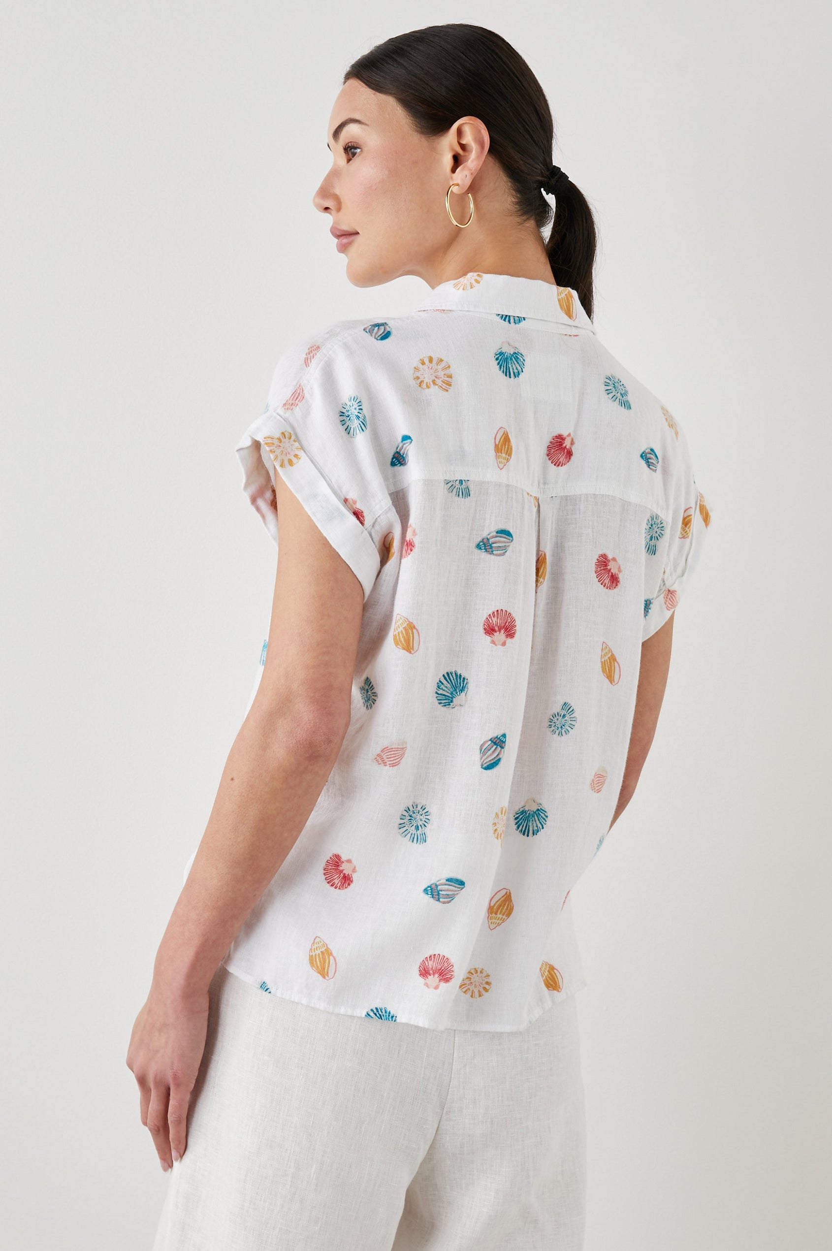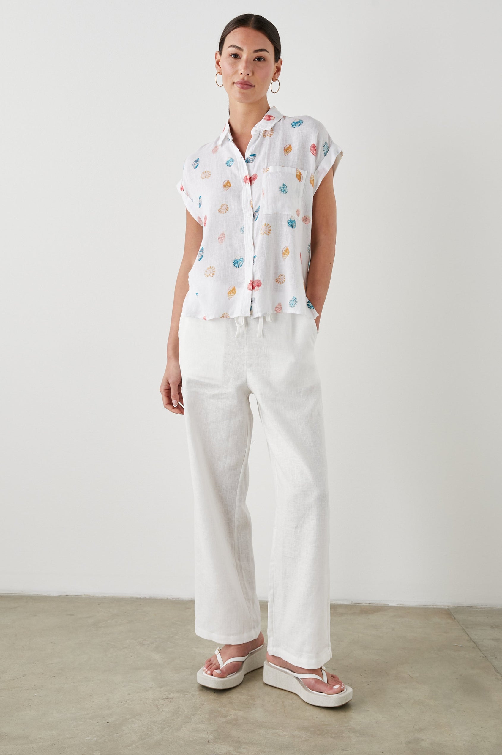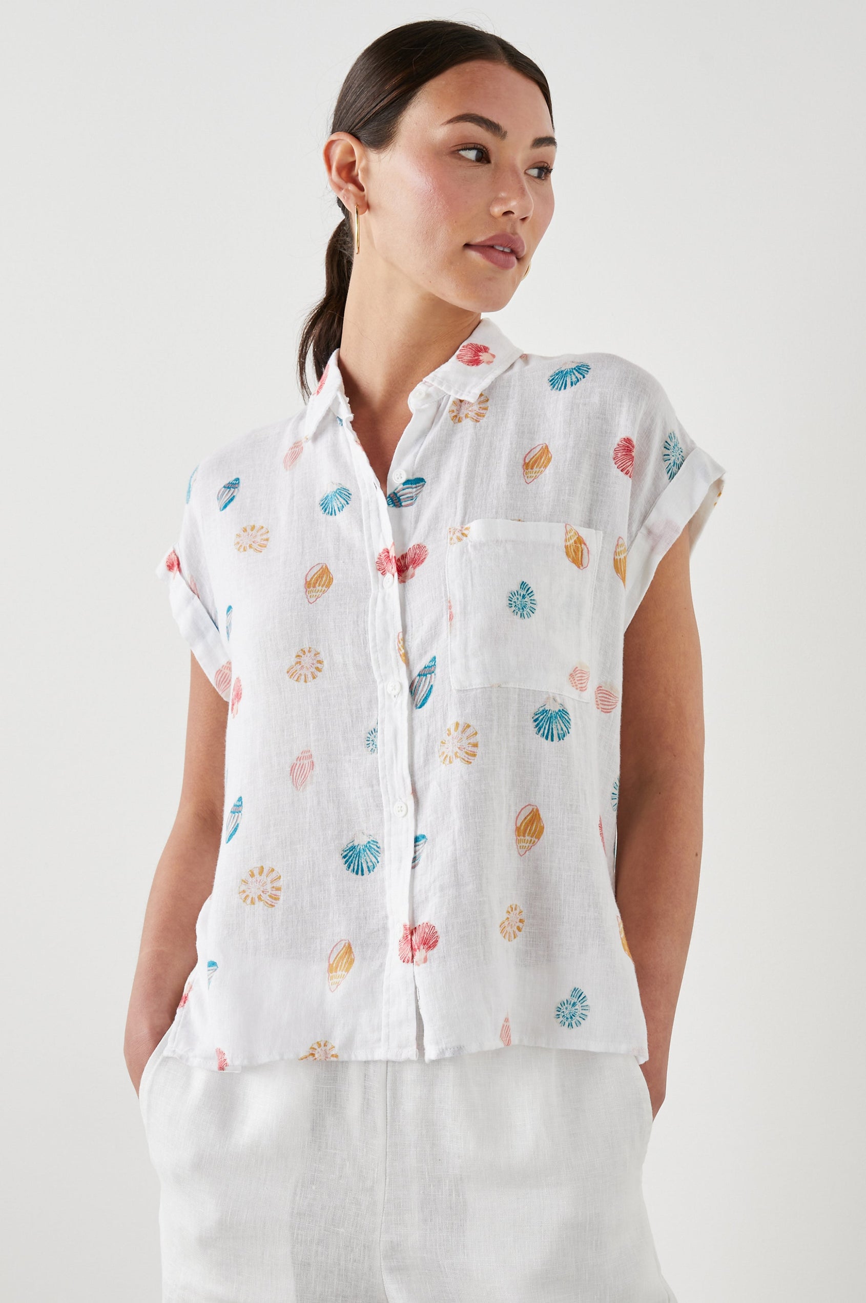 Lightweight, breezy linen fabric mixed with a relaxed body shape makes the Whitney the perfect Southern California inspired button-down. This short sleeve button-down features a subtle navy pineapple striped design throughout, rolled sleeves, high-low hem, and flattering side slits.